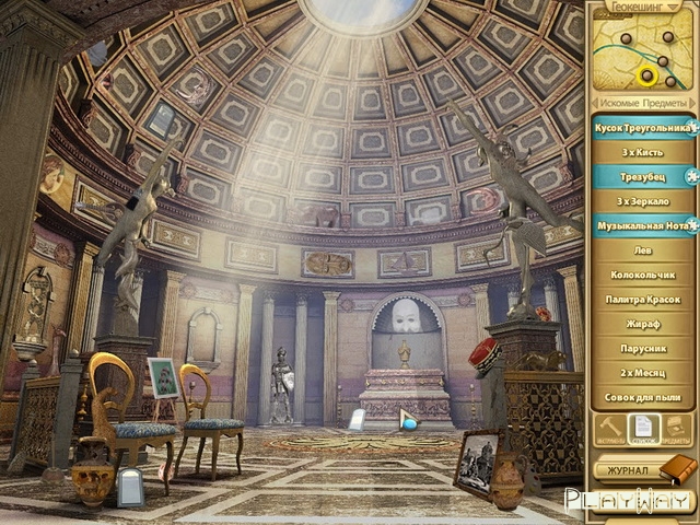 Описание игры: Побег из музея. Часть 2. Поиск пропавших сокровищ – это продолжение первой части игры Побег из музея. Здесь вы также окажитесь в новых местах, которые наполнены различными вещами. Какие из них необходимо отыскать – вы узнаете из списка. Желтым фоном будут помечены обычные предметы, находящиеся на видных местах, а голубым – те, которые чтобы найти, нужно проявить смекалку. Старайтесь внимательно всматриваться даже в самые незначительные области игрового поля, именно там может скрываться какая-то мелкая деталь, которая в будущем станет для вас очень полезной.