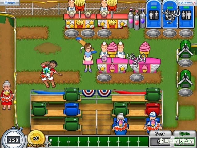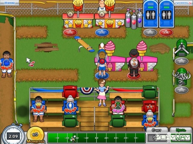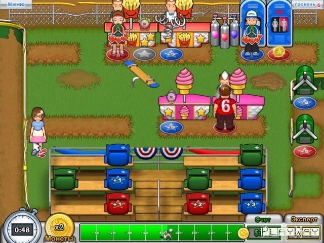 Описание игры: Хлопотунья Беатрис – это увлекательный бизнес симулятор, в котором вы станете управляющим в небольшом кафе и должны заработать достаточно денег для строительства стадиона. В ваше заведение будут заходить клиенты, а вы при помощи мыши сможете переносить их к нужной витрине. Каждое сердечко – это один доллар. Чем больше сердец вы сохраните – тем больше денег получите, так что внимательно следите за настроением каждого клиента. Поначалу все будет более чем скромно. Нанять достаточное количество обслуживающего персонала не получится, но со временем вы сможете развивать свое кафе и совершенствовать его. Не забывайте и о комбо действиях. Если вы перенесете клиента на площадку с идентичным цветом, то вы получите дополнительные бонусы и сможете увеличить свой доход. Вдохните новую жизнь в городок и подарите ему надежду на новую победу.