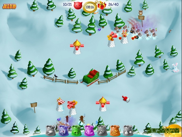 Защитники Азгарда. Здесь вы должны будете выстраивать специальные башни, которые будут стрелять по монстрам. Если обратите внимание, некоторые из них будут переносить новогодние подарки, и когда они уничтожатся выстрелами, то главный эльф соберет их. Но знайте, что выроненный одним монстром подарок, тут же будет подхвачен другим, так что поторопитесь. Здесь же вы сможете получить и монеты, как вознаграждение за верную тактику. Их можно пустить на постройку новых башен или же на улучшение уже существующих. Помимо подарков и монет, стоит не забывать и о бонусах. Собирайте их тоже, они хоть и играют практически незначительную роль, но все же помогут в трудную минуту.