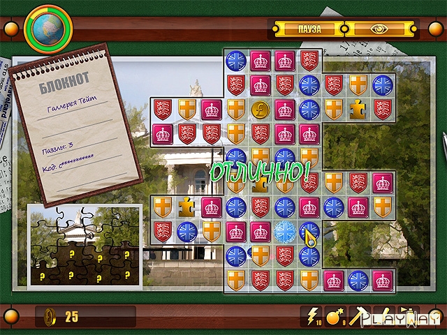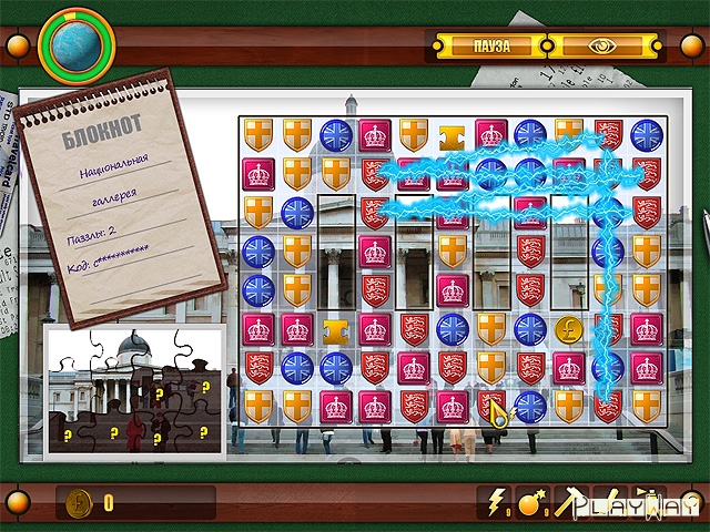 Описание игры: Приключения Джулии. Великобритания – увлекательная история, в которой вы найдете немало загадок. Каждый уровень – это игровое поле, на котором будут располагаться разнообразные символы. Ваша задача как можно скорее опустить пазлы, находящиеся на нем, в самый низ. Для этого составляйте комбинации из трех и более одинаковых деталей и освобождайте дорогу для них. Если все будет складываться удачно, вы сможете получить ряд бонусов и использовать их в своих целях. Плюс дополнительные бонусы вы получите по окончании уровня, если останется отведенное на игру время. Чем больше его – тем больше очков. Плюс ко всему вы будете награждены специальными медалями. Пройдите все задания, составьте картинки по частям и выполните свою миссию. Впереди вас ждет немало сюрпризов, что сделает поездку незабываемой.